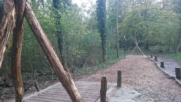 De rode route is 2,9 KM lang en is een kindernatuurpad, loopt om Huize Baak en door t' Hertenbosch waar een hangbrug over de sloot is gespannen en een kabelbaan is gemaakt.